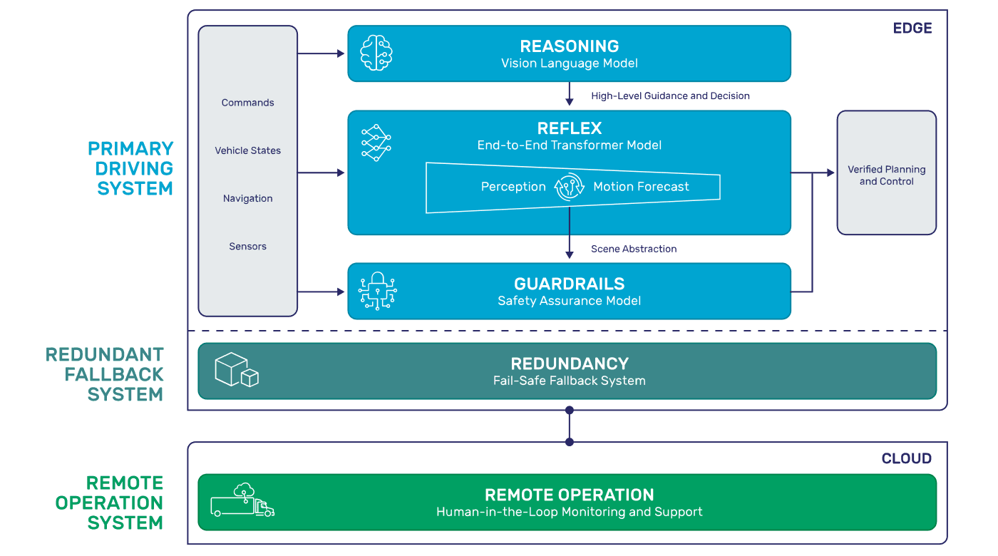 Together, Reflex, Reasoning, Guardrails, and Fallback work in concert to handle routine driving, adapt to the unexpected, block unsafe actions, and safely manage even serious hardware failures – all without reliance on remote control or constant human supervision inside the cab.